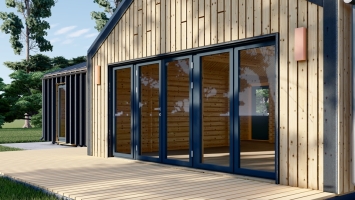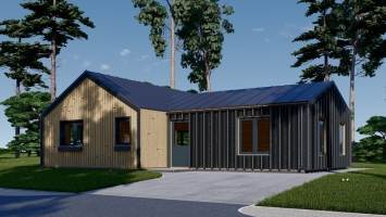 A casa modelo VALERI tem uma uma espaçosa sala de estar de 40 m² com cozinha aberta, que lhe permitirá conversar com a sua família enquanto prepara a sua refeição preferida. Possibilidade de adicionar um grande terraço de 32 m² (característica opcional) e expandir o seu espaço ao ar livre. O arranjo em forma de T oferece um design bonito e aspetos muito práticos. 2 áreas de banho independentes, um maior e outro mais compacto, para maior conforto residencial. Fabricado em madeira de coníferas de alta qualidade que oferece propriedades naturais de isolamento e um ambiente de vida saudável. A VALERI é um dos nossos designs de inspiração escandinava, com minimalismo elegante, linhas arquitetónicas claras e a máxima praticidade que uma construção de madeira de tamanho médio pode oferecer. Janelas grandes, quase do chão ao teto, que abrangem a parte frontal da casa, criam uma aparência atraente e garantem muita luz natural no interior.